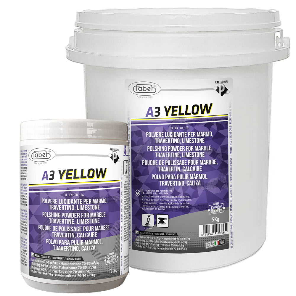 A3 YELLOW yra didelio efektyvumo poliravimo milteliai, Jo speciali formulė leidžia puikiai poliruoti marmurą, kuris nėra pernelyg jautrus, Tai vienas geriausių FABER „A“ serijos marmuro poliravimo produktų dėl savo efektyvumo ir universalumo,