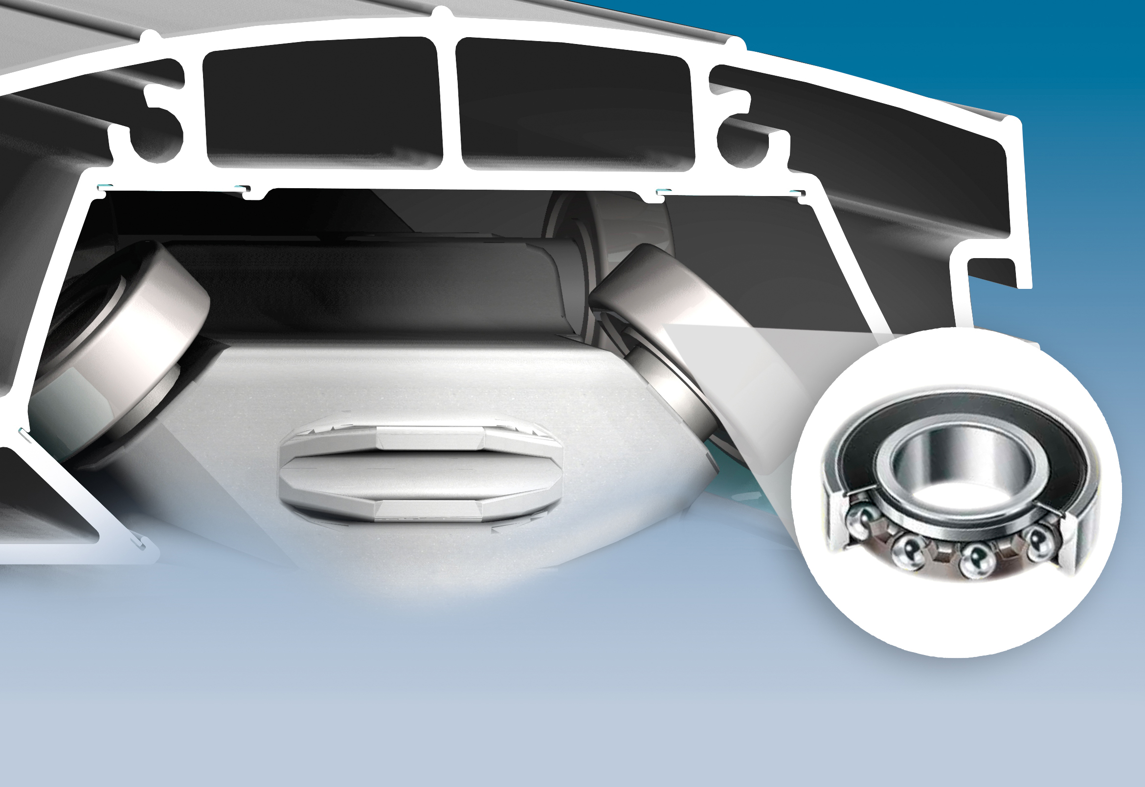 Vežimėlis variklių grupė slysta su 8 rutuliniais guoliais ant keičiamos vėžės.