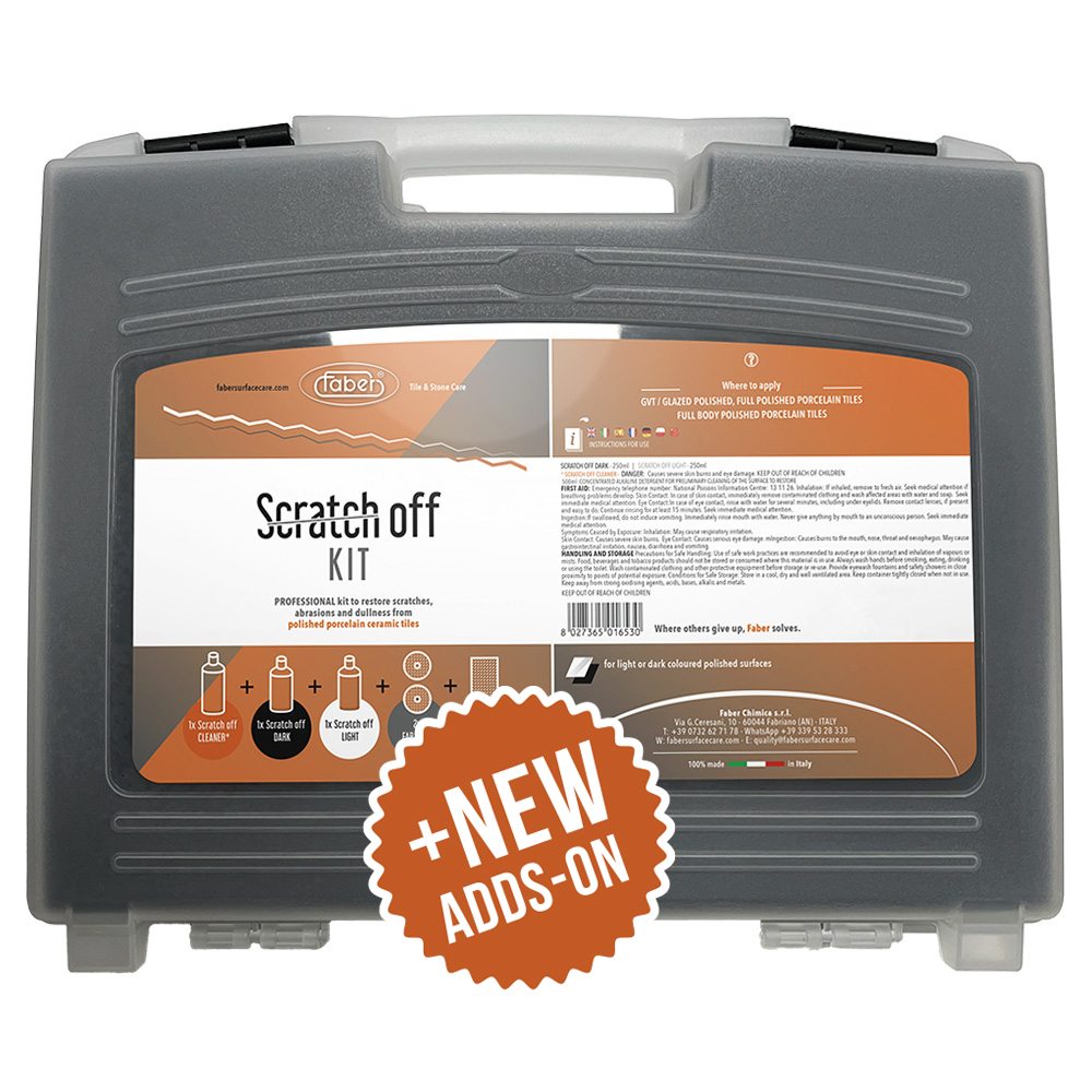 SCRATCH OFF KIT komplektas leidžia greitai, paprastai ir švariai atstatyti defektus ir įbrėžimus ant poliruotų porcelianinių keraminių plytelių.