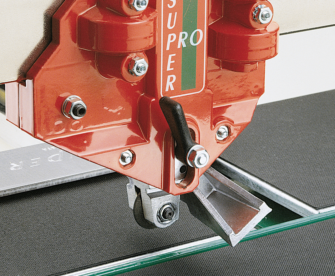 Pjovimas stumiamas ir apdirbamas stalas su spyruoklėmis, kad plytelės lūžtų lengviau. Grafuota plytelių atraminė juosta greitam tiesiam pjūviui.